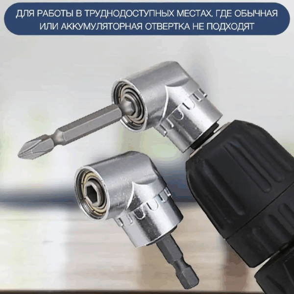 Угловая насадка для шуруповерта 105 градусов для бит предназначена для труднодоступных мест, где обычные наборы угловых отверток не подходят. Бита для шуруповерта устанавливается в шестигранные пазы и удерживается за счет магнита, установленного в корпусе инструмента.