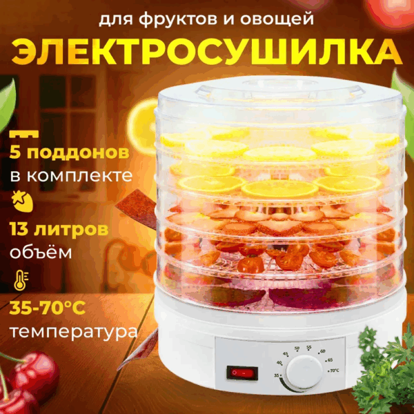Электрическая сушилка для овощей и фруктов — это отличное решение для сохранения полезных свойств продуктов на долгое время. Сушилка позволяет высушивать овощи, фрукты, грибы и даже мясо, при этом сохраняя все витамины и минералы. Благодаря нашей электро сушилке для фруктов и овощей, вы сможете создать запасы полезных продуктов на зиму или просто порадовать себя и своих близких вкусными и полезными закусками.