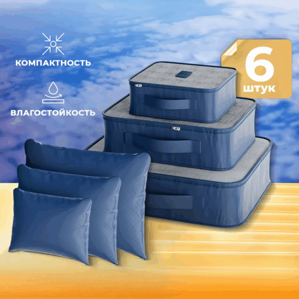 Набор органайзеров для чемодана состоит из дорожных сумок разного размера и формы, который служит для компактной транспортировки вещей. Органайзеры для багажа выполнены из водонепроницаемой ткани, которая защищает одежду, белье, документы и другие ценные предметы. Дорожный набор состоит из 6 тканевых органайзеров с молнией разных размеров. Это позволяет аккуратно расположить вещи внутри багажа и подготовиться к отпуску.