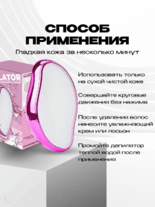 Используйте только на сухой и чистой коже, так как влажную кожу легко травмировать. Попробуйте сначала на небольшом участке тела, убедитесь, что нет покраснения или раздражения. Держите депилятор параллельно поверхности тела и совершайте круговые движения без нажима. Не трите сильно! После удаления волосков, нанесите любое успокаивающие средство: крем, лосьон. Промойте депилятор теплой водой.
