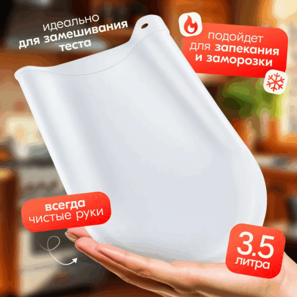 Силиконовый мешок для замеса теста — это удобный и практичный инструмент, который предназначен для упрощения процесса приготовления теста и хлебобулочных изделий на вашей кухни. Кулинарный мешок для теста изготовлен из пищевого силикона, что делает его долговечным и легким в уходе. Мешок имеет достаточно большой объем, чтобы вместить необходимое количество ингредиентов для замеса теста.