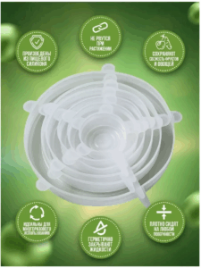 Растягивающиеся крышки изготовлены из пищевого силикона и безопасны при использовании с различными продуктами. Они легко моются от пищи с использованием моющих средств и без. Многоразовые крышки удобные и экологичные, засчет чего они отлично заменят использование на кухне полиэтиленовых пакетов и пищевых пленкок для упаковки продуктов.