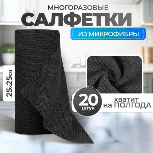 Салфетки из микрофибры 25×25 см (20 штук) — идеальный набор для быстрой и эффективной уборки! Мягкий, но прочный материал отлично впитывает влагу и удаляет пыль, жир и грязь без использования химии.