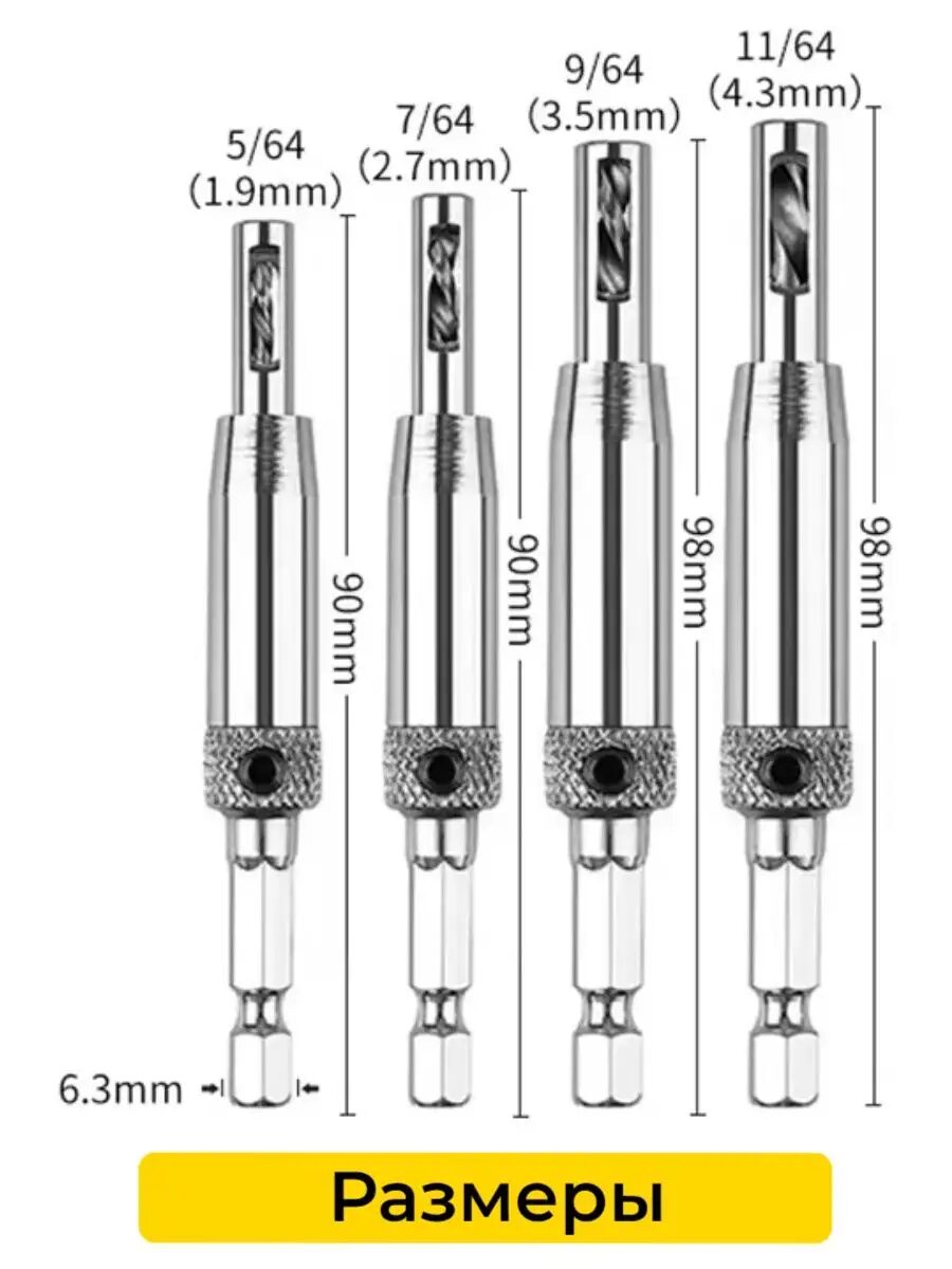 Профессиональный набор самоцентрирующихся сверл для оконных, дверных и мебельных петель (4 сверла в комплекте + ключ).