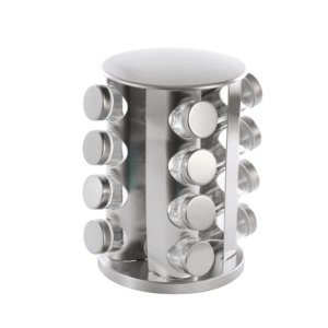 Наборы для специй состоят из 16 или 12 стеклянных банок с металлическими крышками и вращающимся основанием. Баночки не содержат специй. Стеклянные банки для специй с подставкой являются продукцией, отвечающей стандартам качества. Герметичные банки для специй изготовлены из закаленного стекла, которое устойчиво к ударам и перепадам температур, имеет прозрачные стенки, позволяющие проверить количество и вид специй.
